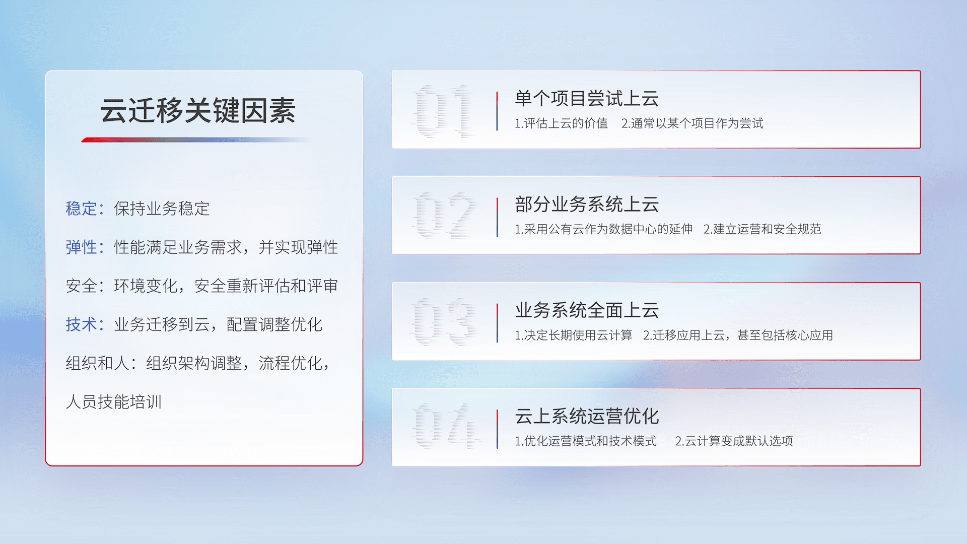 结合实际业务,,,从规划设计、、、、云平台选型、、、云原生改造、、数据迁移、、、集成交付,,迁移全过程为客户识别最佳上云路径,,,,做好风险识别管理,,,设计网络架构、、、身份权限、、、安全审计合规、、、、操作审计、、、日志审计、、监控告警策略、、、、多站点容灾设计等,,,对云上基础设施进行整体规划,,,提升IT治理水平,,以满足弹性、、、高可用、、、、高性能的需求。。。。